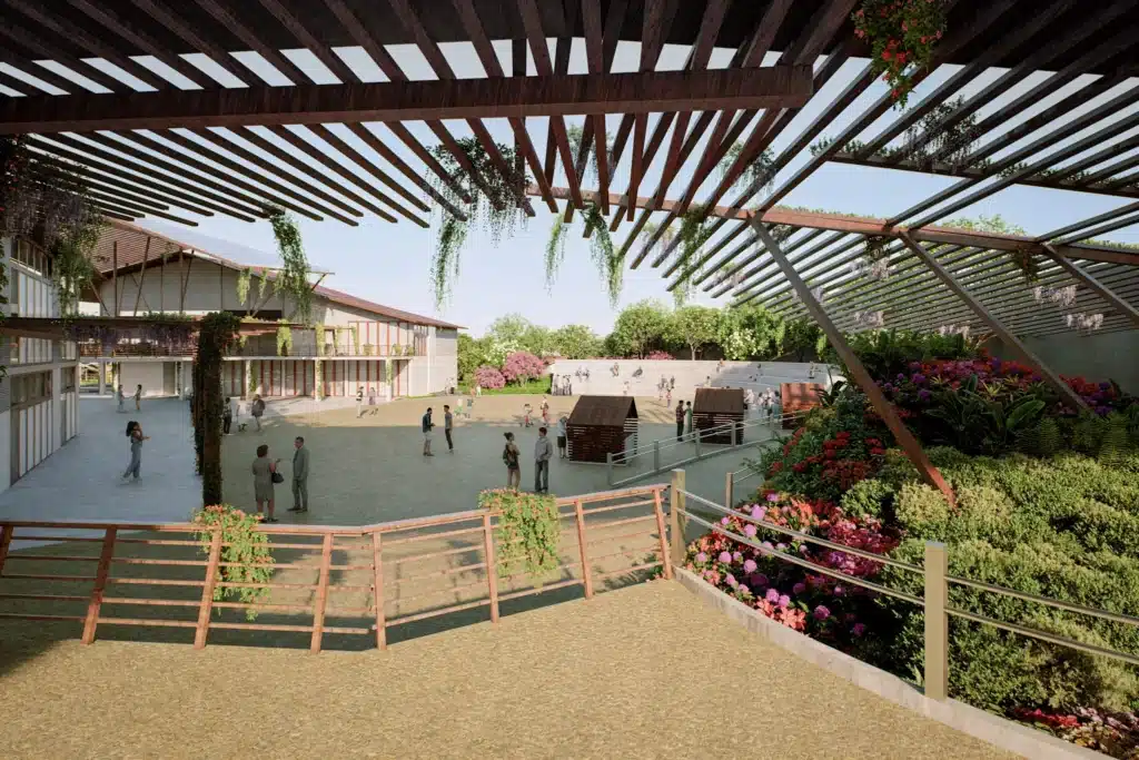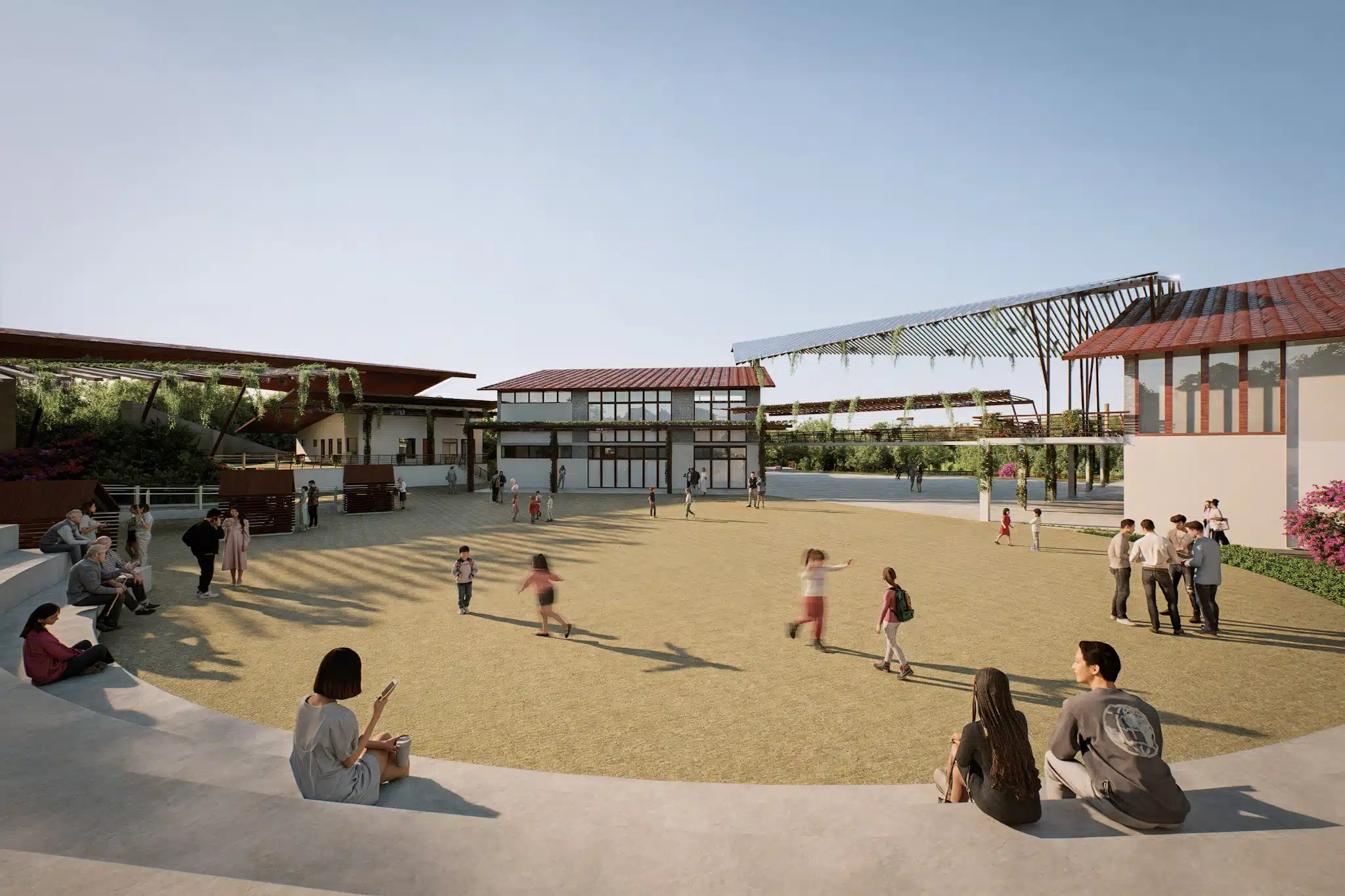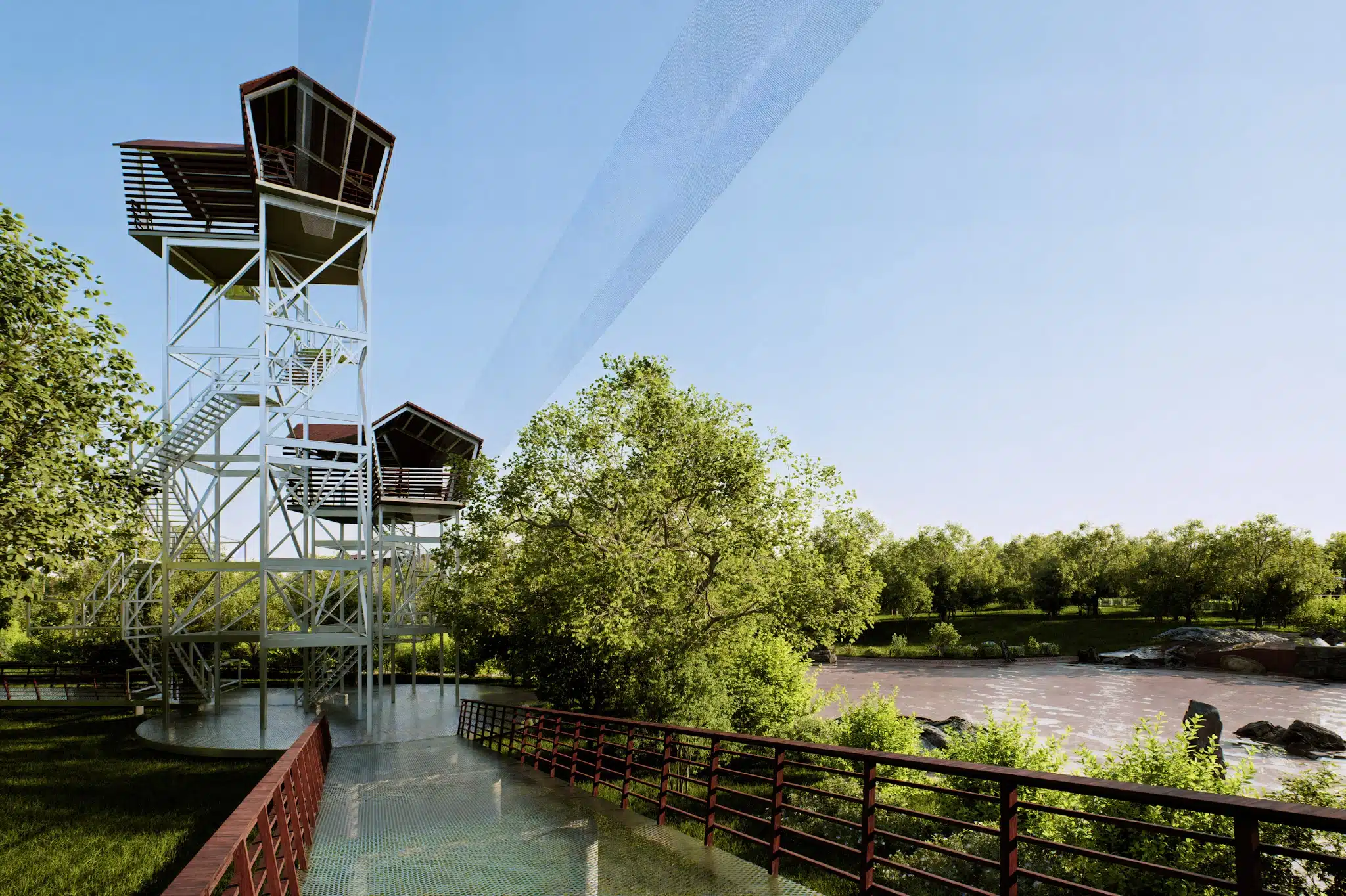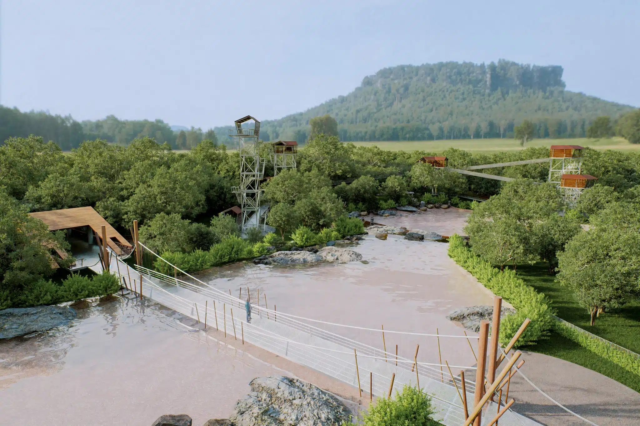 Arquitectura que emerge del mito y la piedra. Los volúmenes, anclados al terreno, evocan las rocas inmóviles del relato ancestral y se abren al sonido del agua.