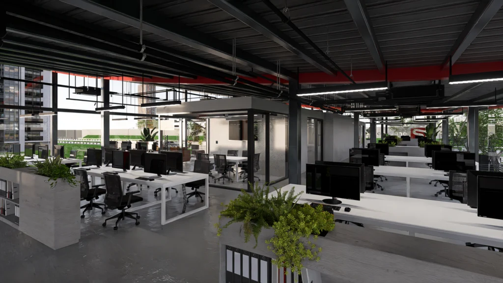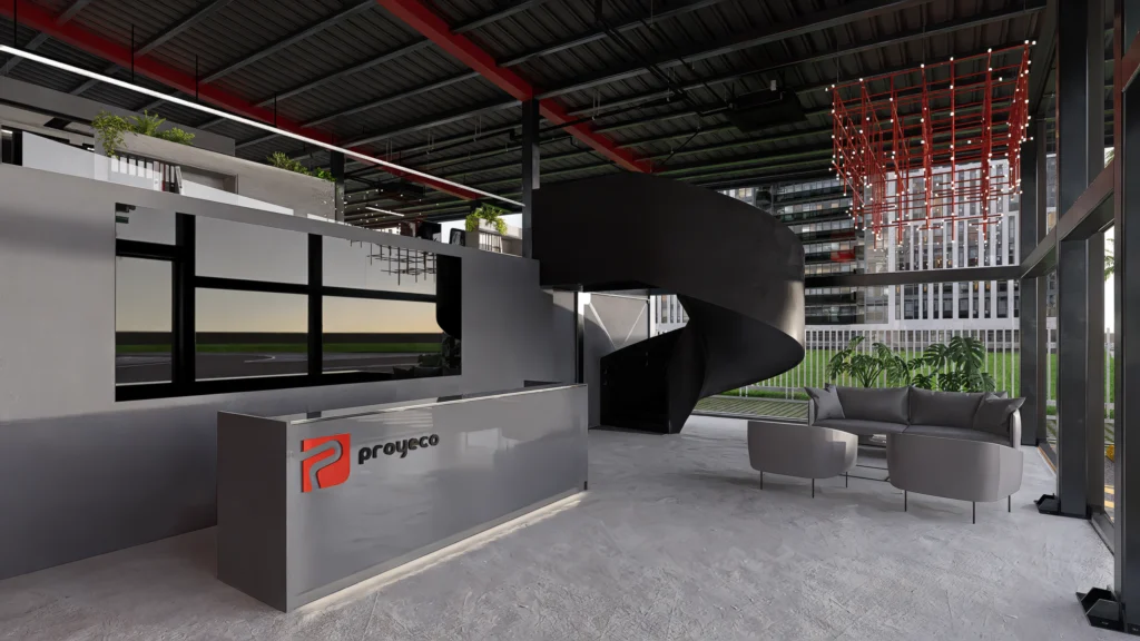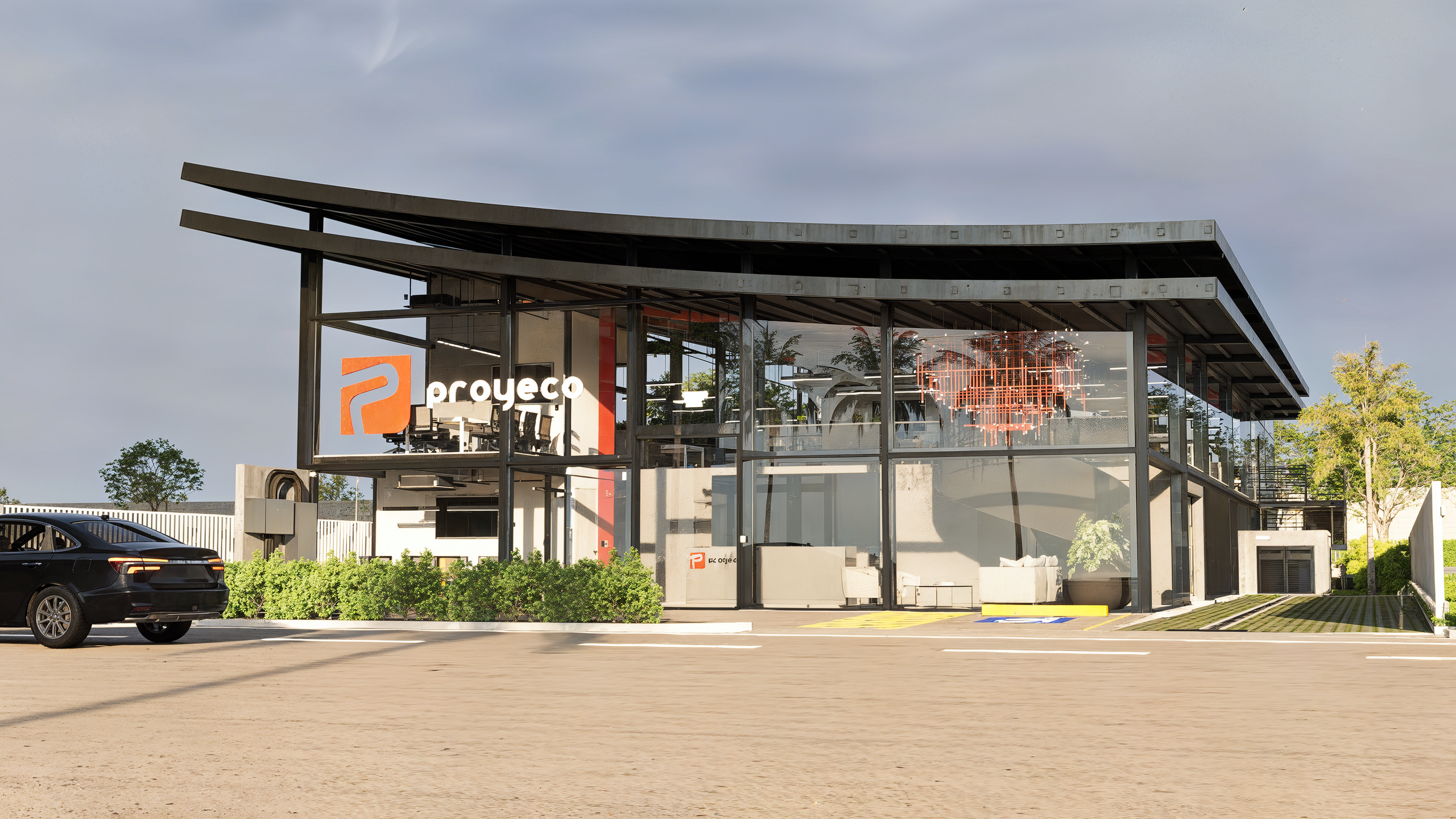 Las oficinas Proyeco Panamá es un proyecto integral que abarca desde el diseño arquitectónico e interior hasta su ejecución completa. La propuesta adopta una estética industrial contemporánea, con el uso de vidrio, metal y concreto como elementos principales que definen un espacio moderno, abierto y funcional.