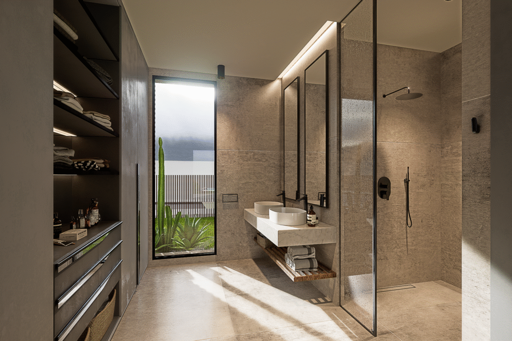 La arquitectura se plantea desde una lógica racional y geométrica, con volúmenes puros revestidos en sistemas de aislamiento térmico exterior (SATE) y carpinterías de altas prestaciones. Las cubiertas planas, transitables, ofrecen zonas de solárium y albergan una de las tres piscinas del conjunto: una exterior-jardín, una interior-spa y una superior en cubierta, cada una pensada como extensión sensorial de la experiencia arquitectónica.